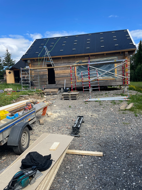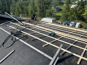 Här ser ni ett stort och prydligt tvåvåningshus med entré och balkong, beläget i byn Glöte utanför Lofsdalen. Vi fick äran att ta över arbetet med fastigheten där ett takbyte stod på schemat. Arbetet inleddes med att vi rensade upp runt huset och tog bort allt skräp, inklusive sticktak, panelbitar, spik och läkt. Innan vi kunde påbörja själva takarbetet behövde balkongen och entrén riktas upp, då taket annars hade upplevts som snett. Detta åtgärdade vi genom att använda olika domkrafter, vilket i många fall är en effektiv och fullt tillräcklig metod. Nästa steg i processen var att plocka bort ströläkt, bärläkt, takpapp samt tejpen runt skorstenen. I samband med detta upptäckte vi att det låg 18 mm råspont, vilket inte är godkänt enligt svenska byggstandarder. För att hitta en så bra lösning som möjligt för kunden kom vi fram till att låta råsponten ligga kvar, men istället bygga extra takstolar samt underliggare för att stadga upp både råsponten och resten av takkonstruktionen. Därefter lade vi ny takpapp tillsammans med ströläkt och bärläkt. Eftersom det skilde cirka 10 cm från sida till sida krävdes stor precision när läkten sattes för att få taket helt rakt. Självklart monterades även fotplåten innan detta arbete. När allt underarbete var klart började vi lägga plåttaket, vilket gick i ett bra tempo. Medan två av våra medarbetare arbetade vidare med plåten och avslutningen av takbytet, tog kunden beslutet att även låta JBK ge deras ladugård lite välbehövlig omtanke. Arbetet på ladugården innebar att vi höjde upp hela byggnaden, riktade upp stommen, förstärkte vissa balkar, monterade snörasskydd, bytte dörrar i öppningen samt skruvade fast de tjocka, anrika brädorna som fungerar som golv. Den största utmaningen var att räta upp stommen och höja ladugården. Eftersom byggnaden är gammal och skör tog vi extra tid på oss för att utföra arbetet mycket noggrant. Resultatet blev riktigt bra. Utöver detta utförde vi även två mindre uppdrag. Det första var att bygga två handledare vid varsin entré för att underlätta för kunden, då halka annars kan innebära en risk för fall. Det andra uppdraget bestod av att montera vindskivor på ett annat hus där sådana tidigare saknades. På grund av den branta taklutningen nådde vi inte upp med ställningen, vilket gjorde att vi istället använde säkerhetslina och sele under arbetet.