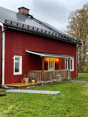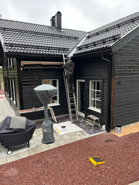 På schemat stod ett fasadbyte i Lit – ett projekt som snabbt visade sig bli både omfattande och väldigt givande. Uppdraget innebar att iordningställa tomten, garaget och delar av huset som med tiden blivit ganska nedgångna. Ett sådant projekt tackar man förstås inte nej till, och det blev ett arbete vi följde från start till mål med ett tydligt och synligt resultat. Det kändes extra betydelsefullt för oss att ta oss an arbetet, då platsen är konsumentens drömboende med en fantastisk utsikt. Att få bidra till att förverkliga visionen för en sådan plats gav projektet en särskild motivation. Arbetet inleddes med att röja tomten för att skapa goda förutsättningar att arbeta runt både huset och garaget. Två personer arbetade med röjsåg medan en tredje körde traktor med slaghacka för att snabbt och effektivt få ordning på området. När tomten var iordningställd gick vi vidare till huset. Kundens vision var att byta panel på två sidor av huset, rusta upp farstukvisten och bygga om den mindre altanen. Samtliga ytor målades dessutom två gånger med klassisk Falu rödfärg för att ge huset ett hållbart och tidstypiskt uttryck. Under rivningen av den gamla panelen tog kunden beslutet att all ny panel skulle spikas för hand. Det var en utmaning vi gärna antog. För att kunna arbeta säkert och effektivt använde vi både skylift och byggställning för att nå samtliga ytor. Själva panelbytet gick i ett bra tempo, vilket skapade en positiv energi i teamet genom hela arbetet. När panelen och ribborna sedan var färdigmålade tog vi oss an garaget. Byggnaden hade tidigare fungerat som stall och skulle nu omvandlas till ett funktionellt garage. Vi rev därför ut stora delar av det gamla materialet innan vi noggrant städade och skrubbade hela utrymmet för att få bort både smuts och kvarvarande dofter. Resultatet blev ett stort lyft för både huset och omgivningen. Konsumenten uttryckte stor uppskattning för arbetet, vilket vi är mycket stolta över. Kvalitet, noggrannhet och god kommunikation är något vi alltid strävar efter i våra projekt. Det här blev helt enkelt ett riktigt roligt projekt – fyllt av hårt arbete, god stämning och många skratt längs vägen.