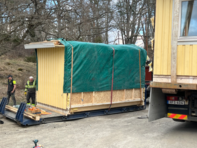 Vi fick förtroendet att genomföra en omfattande husflytt från Tyresö till Jämtland – ett uppdrag som väckte både engagemang och nyfikenhet redan från start. Projektet innebar att demontera, transportera och återuppföra ett hus från grunden, med stor noggrannhet i varje steg. Huset är ett Hudikhus, ursprungligen uppfört 1991 och under flera år har det använts som ett utställningshus. Efter en tid placerades det på en torpargrund i Tyresö, Stockholm. Byggnaden omfattade 40 kvm och var invändigt i princip oinrett, förutom ett klinkergolv. Tack vare att bjälklaget låg med cc 30 – anpassat efter klinkergolvet – förenklades lyftet med kran avsevärt. För att effektivisera demontering och transport valde vi att dela upp huset i tre större moduler, ungefär 2 ton styck, istället för att montera ner det vägg för vägg. Förberedelserna inför flytten tog cirka en vecka. Med hjälp av kran lyftes modulerna varsamt på plats på lastbil, där de säkrades och täcktes noggrant inför den åtta timmar långa transporten till Jämtland. Väl på plats stod en förberedd varmgrund klar – projekterad och gjuten av oss i förväg för att säkerställa ett smidigt montage. Med hjälp av hjullastare och grävmaskin kunde vi därefter placera huset på sin nya grund. Återuppförandet tog en dag, inklusive en förlängning av huset med fem meter. För att skapa en mer balanserad helhet kompletterades byggnaden även med en farstukvist som gjorde att den totala boytan uppgick till 70 kvm. Takets anpassning krävde lite extra omsorg då takstolarna behövde förstärkas för att uppfylla kraven för snözon 3.5. Att läkta om ett befintligt tak innebär alltid utmaningar då äldre konstruktioner ofta är ojämna. Men, med noggrannhet och erfarenhet föll allt på plats enligt plan. Detta är ett projekt vi är mycket stolta över. Det ställde höga krav på planering, logistik, projektering och lagarbete – och är ett tydligt exempel på vår förmåga att genomföra komplexa uppdrag med precision och kvalitet. Liknande projekt tackar vi gärna ja till framöver om vi får chansen!